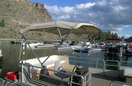 This top is perfect for the fisherman who needs more room to maneuver, or for the pontoon with a side gate location that interferes with proper mounting of the top to the rails. Our Free-Standing top is available in complete top kits only with matching storage boot, with zippered sleeves and running-light cut-out.